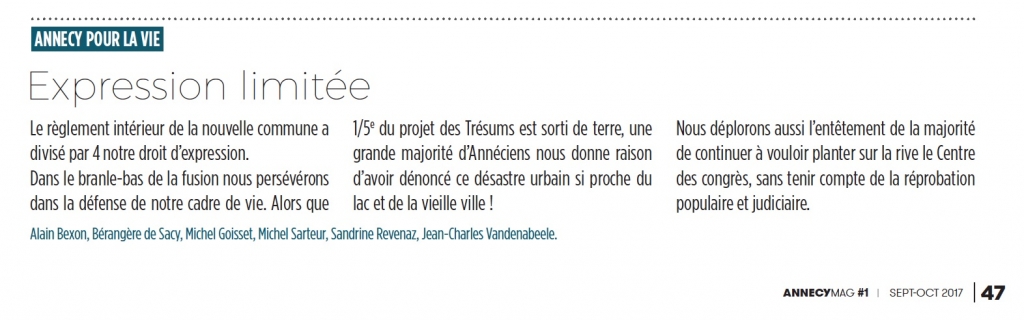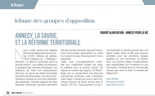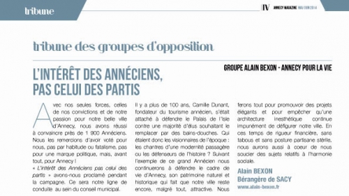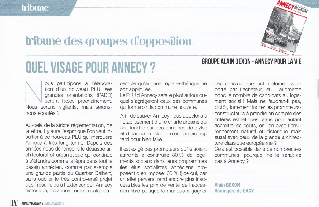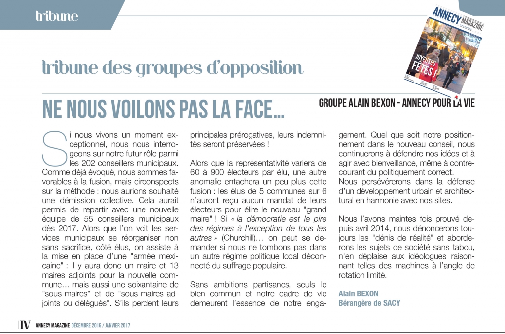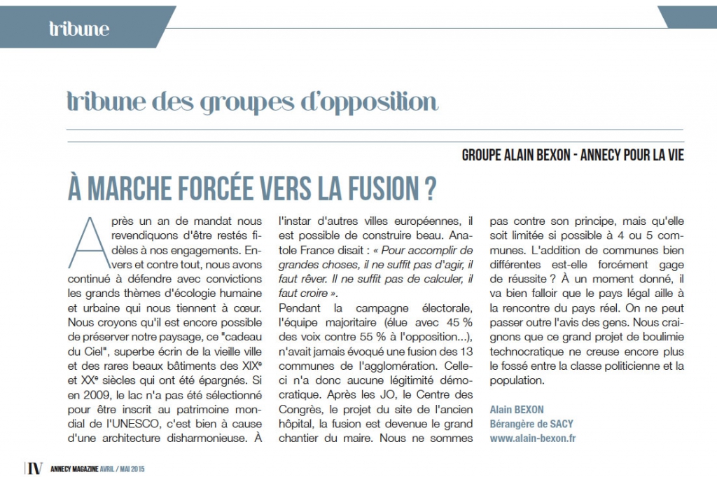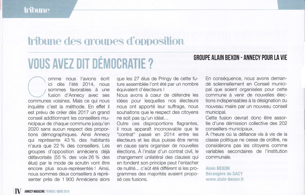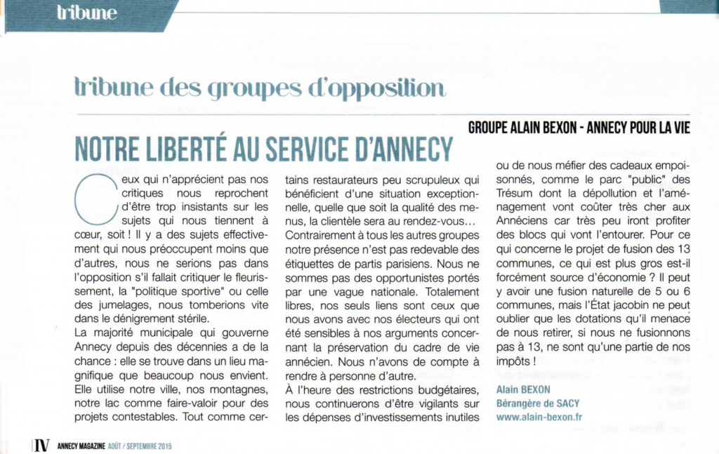 Nos tribunes libres dans Annecy magazine Circulez, il n’ a rien à voir ! Lire la suite La Troisième voix Lire la suite Inutilité publique Lire la suite Quel visage pour Annecy ? Lire la suite Une couche technocratique supplémentaire Lire la suite Expression limitée Lire la suite La farce fusionnelle Lire la suite Ne nous voilons pas la face… Lire la suite Vous avez dit démocratie ? Lire la suite Parlez-vous français ? Lire la suite Un cas d’école Lire la suite Notre liberté au service d’Annecy Lire la suite La banque du bon sens Lire la suite À marche forcée vers la fusion ? Lire la suite Une erreur historique Lire la suite Une victoire du droit sur les passe-droits Lire la suite Vous avez dit classique ? Lire la suite Annecy, la Savoie et la réforme territoriale Lire la suite L’intérêt des annéciens, pas des partis Lire la suite Snobisme anglomaniaque Lire la suite