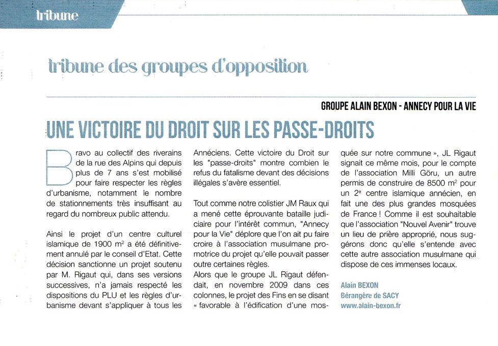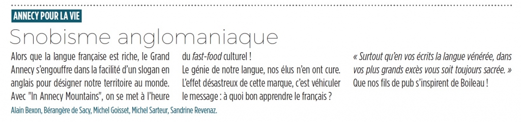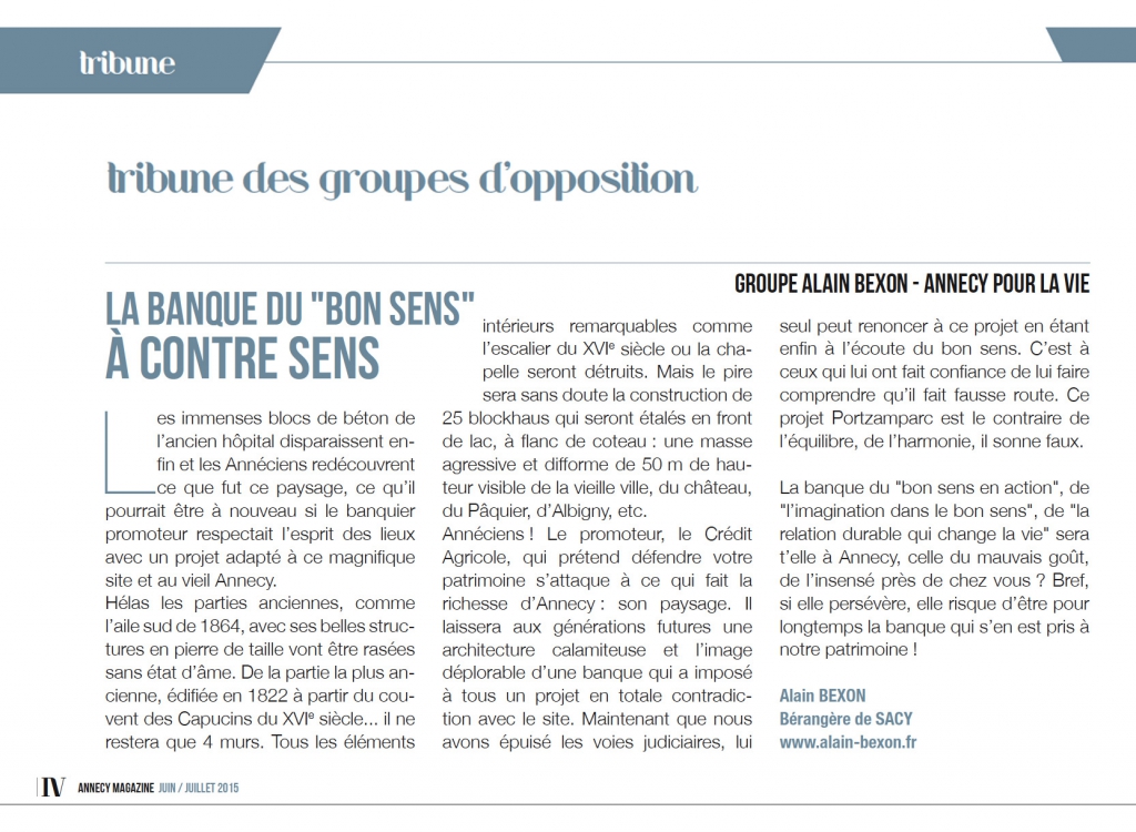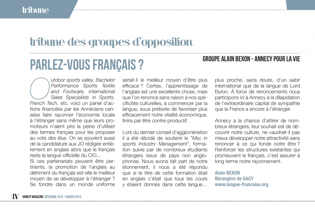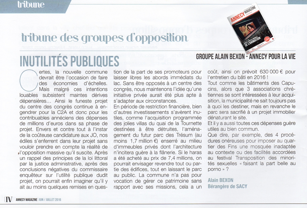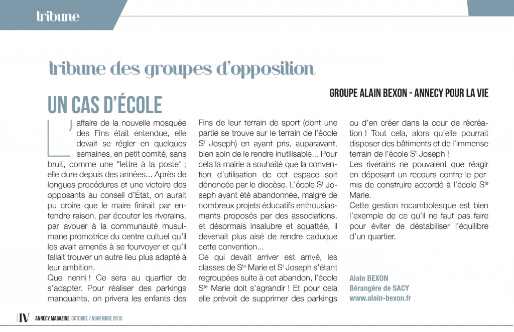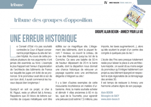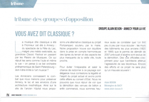 Nos tribunes libres dans Annecy magazine Circulez, il n’ a rien à voir ! Lire la suite La Troisième voix Lire la suite Inutilité publique Lire la suite Quel visage pour Annecy ? Lire la suite Une couche technocratique supplémentaire Lire la suite Expression limitée Lire la suite La farce fusionnelle Lire la suite Ne nous voilons pas la face… Lire la suite Vous avez dit démocratie ? Lire la suite Parlez-vous français ? Lire la suite Un cas d’école Lire la suite Notre liberté au service d’Annecy Lire la suite La banque du bon sens Lire la suite À marche forcée vers la fusion ? Lire la suite Une erreur historique Lire la suite Une victoire du droit sur les passe-droits Lire la suite Vous avez dit classique ? Lire la suite Annecy, la Savoie et la réforme territoriale Lire la suite L’intérêt des annéciens, pas des partis Lire la suite Snobisme anglomaniaque Lire la suite